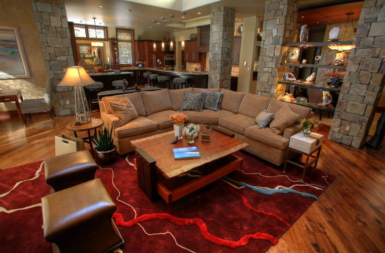 You’ll find a red washer and dryer in the laundry room; a red leather chair with a red duvet and pillow shams in the bedroom; and red-laced antique rugs and red piping on furniture in the living room – all with a Rocky Mountain West flavor.